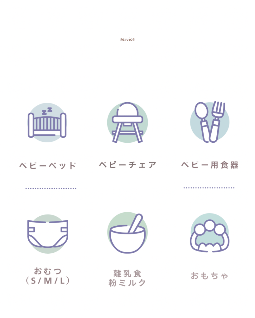 オムツ全サイズ、おしりふき、粉ミルク、着替えの服全てこちらでご提供いたします。