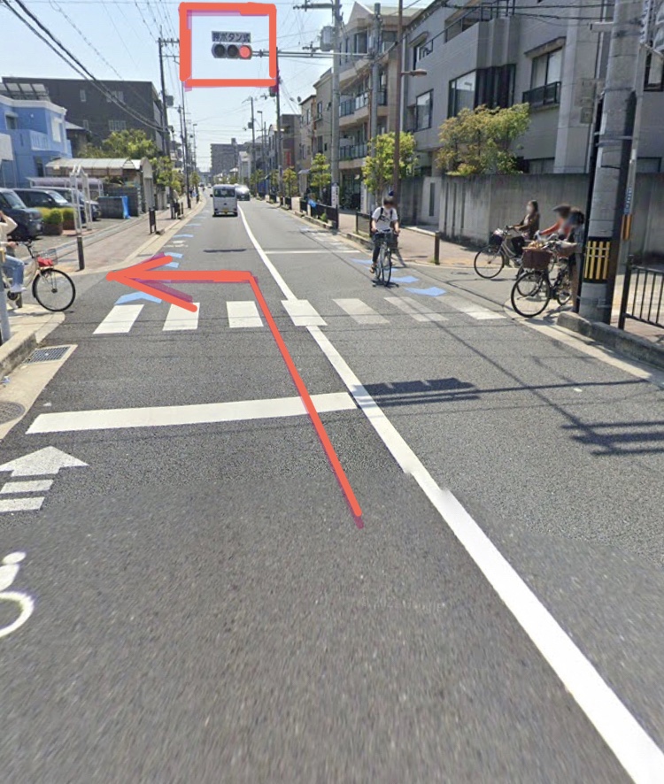 しばらく進むと押しボタン信号があるので