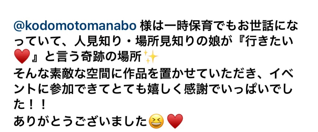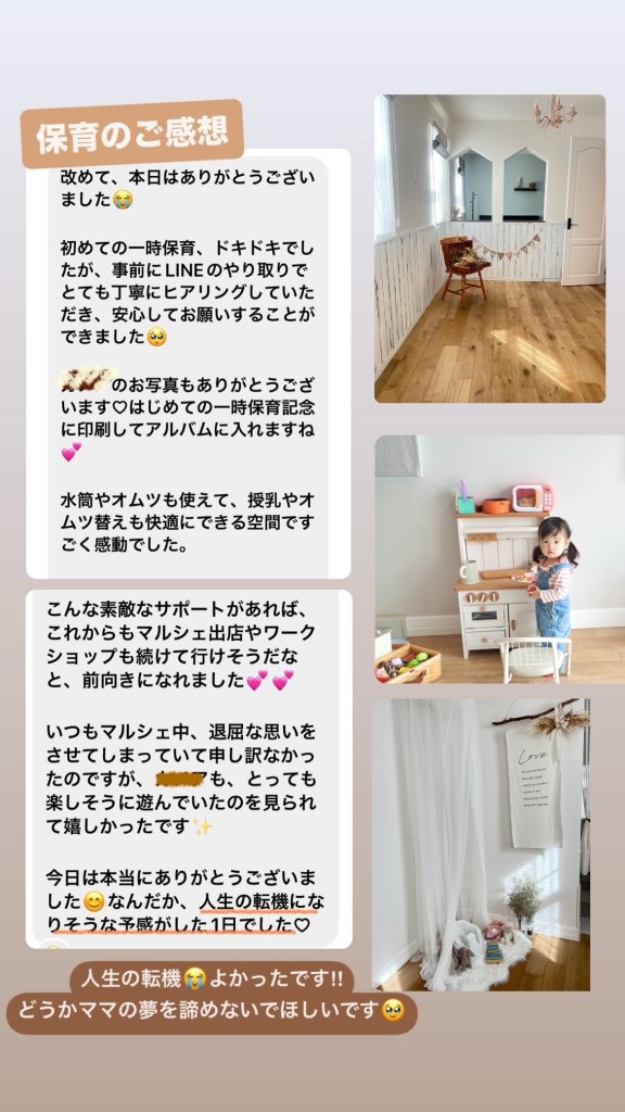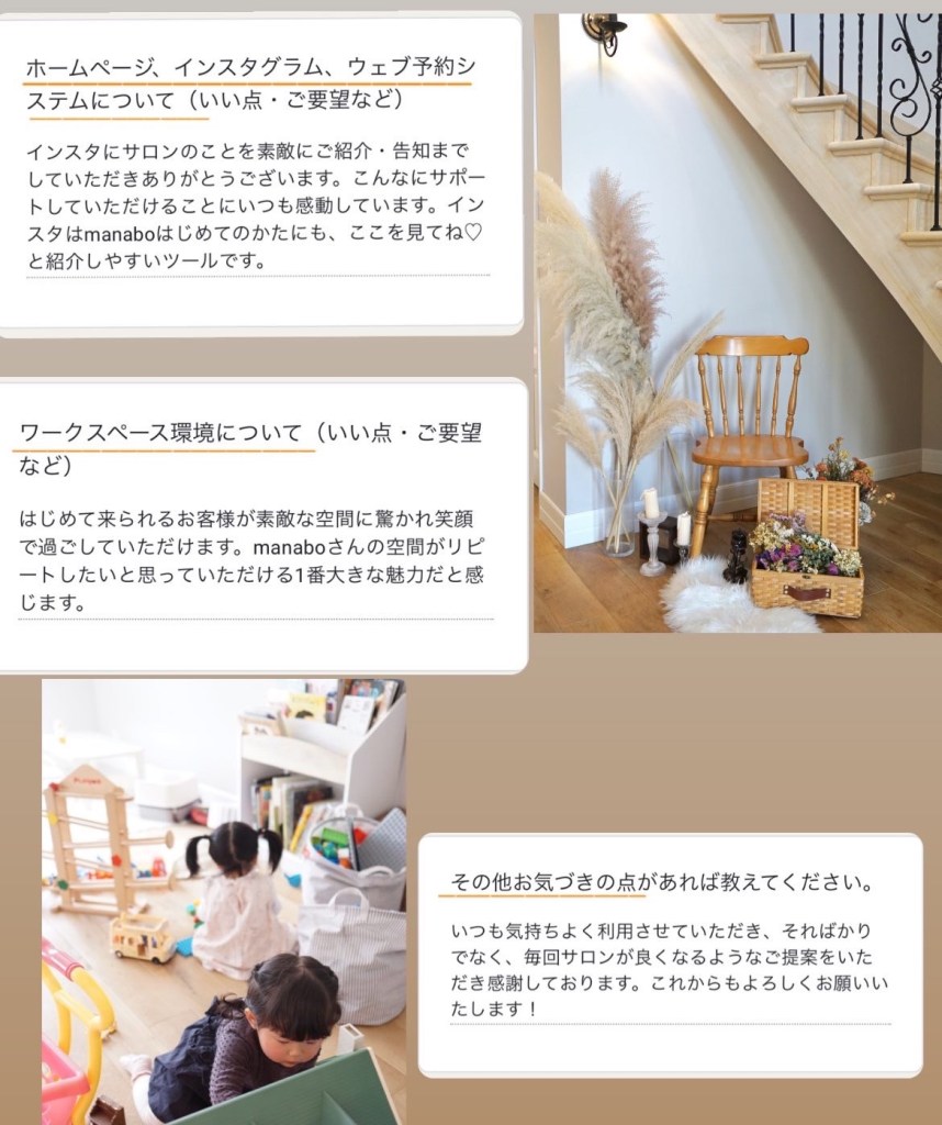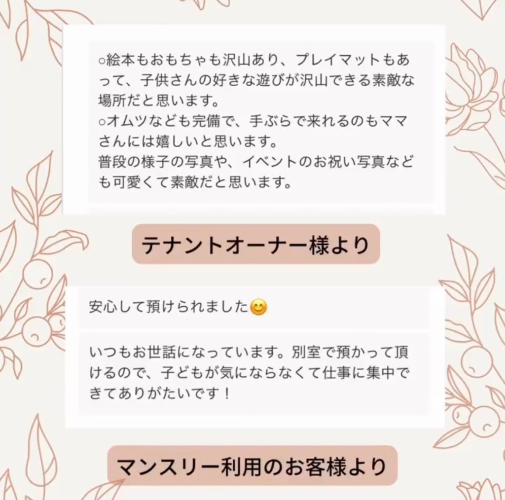 サロンやレッスン開催の講師の方々や一時保育をご利用頂きました皆様からのご感想です。
